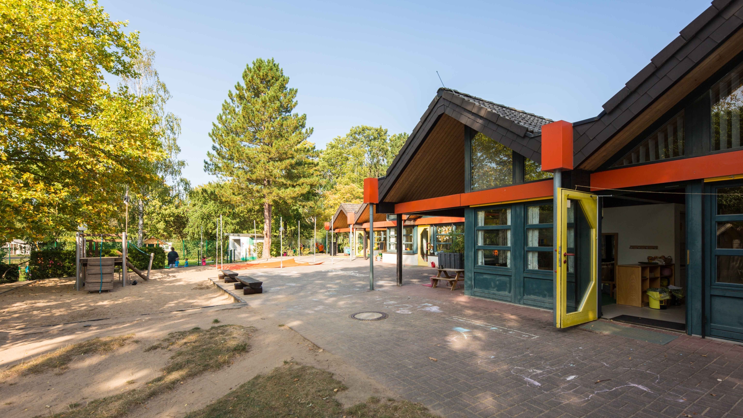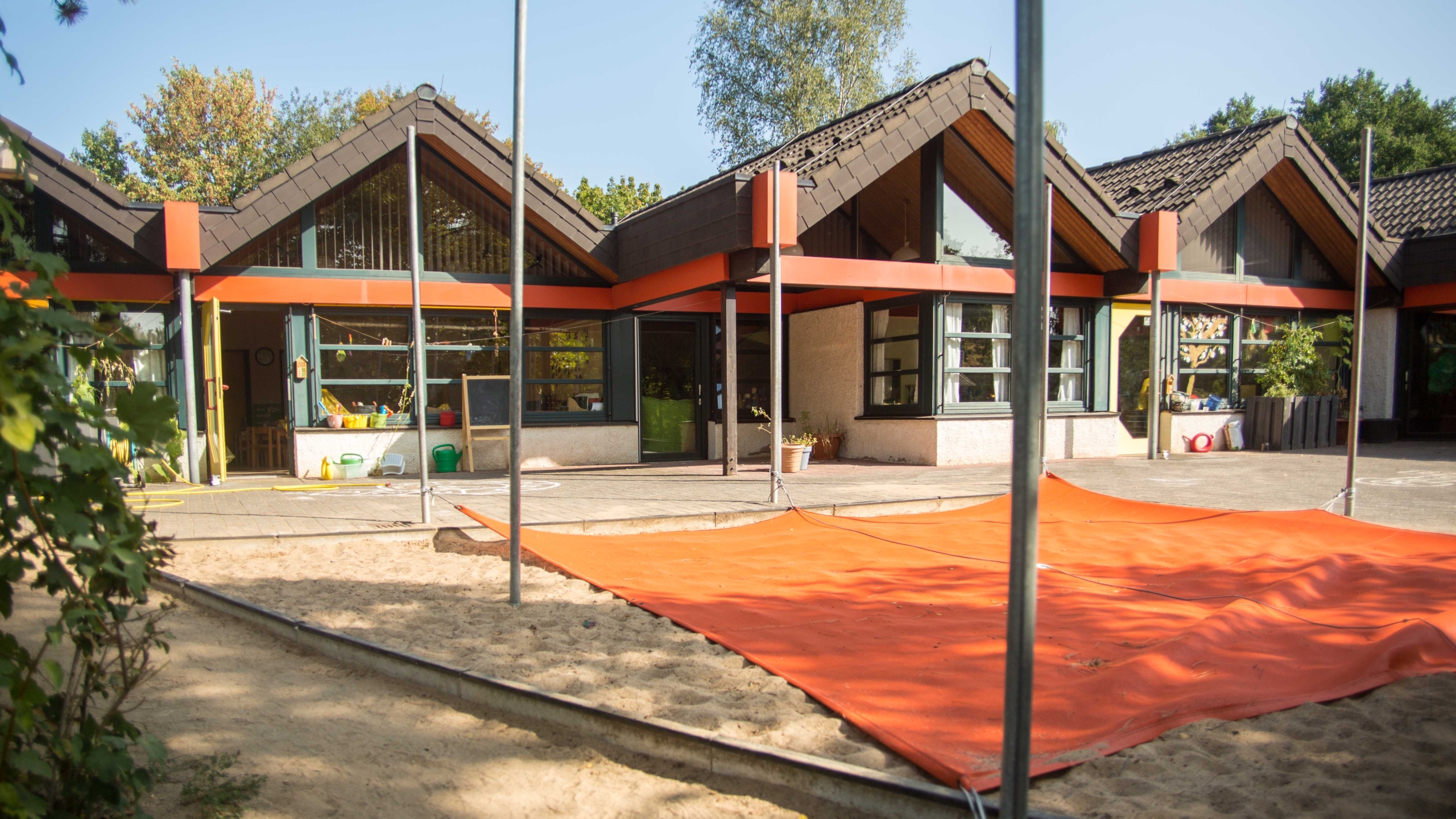 Im Außenbereich gibt es einen großen Sandkasten mit Kletterhaus, der zum Teil mit einem Sonnensegel beschattet wird. Daneben gibt es eine Vogelnestschaukel, ein Spielehäuschen, eine Matschküche, eine Hangrutsche, ein Forschergarten und genug Platz, um mit diversen Fahrzeugen zu fahren. Die Kinder pflegen Hochbeete, kleine Gemüsebeete und einen Apfelbaum.