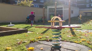 Das weitläufige Außengelände kann durch die Räumlichkeiten der Kirchengemeinde erreicht werden. Es gehört zu unserem pädagogischen Konzept, dass wir das Außengelände mit Wiese, Sandkasten, Schaukel, Klettergeräten und Rutsche bei Wind und Wetter nutzen. Die Kinder haben dadurch die Möglichkeit die Natur mit allen Sinnen zu entdecken. Außerdem werden das nahe liegende Feld und der Wald bei regelmäßigen Ausflügen erkundet.
