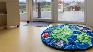 Im großräumigen Flur können sich die Kinder mit Buntstiften, Wachsmalstiften und vielerlei unterschiedlichen Klebe- und Bastelmaterialien künstlerisch ausleben. Der Flur dient als Ergänzung für die Kreativwerkstatt oder gerne mal als Ort für Konstruktionszeichnungen aus der „Baustelle“.