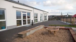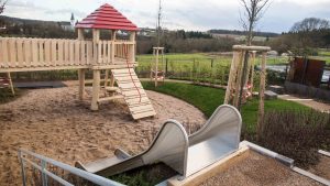 Unser Außengelände kann von den Kindern im gesamten Tagesablauf genutzt werden und bietet mit zwei Sandflächen, einer Nestschaukel, einem Kletterturm sowie vielen naturgehaltenen Nischen viele Spielmöglichkeiten.