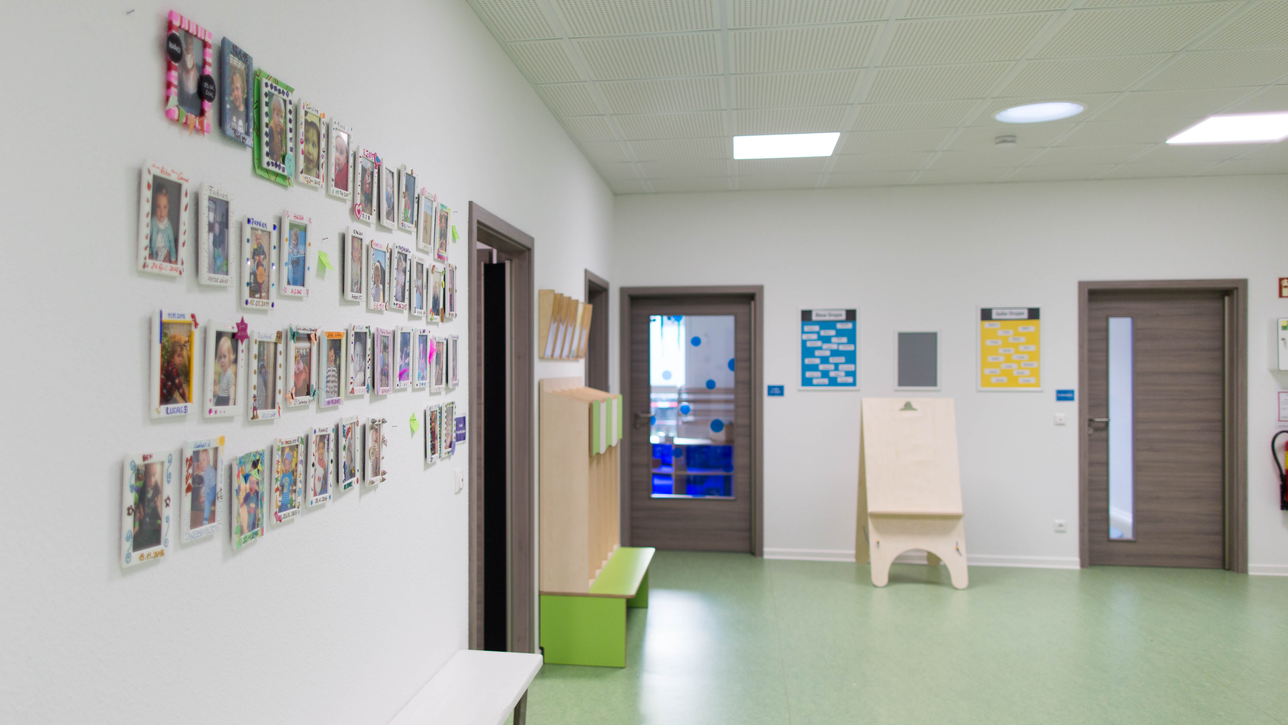 Die hell gestalteten Räume des neuen Gebäudes sind an den Bildungsbereichen der Bildungsvereinbarung NRW orientiert und laden zum eigenständigen Entdecken ein.