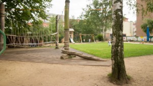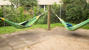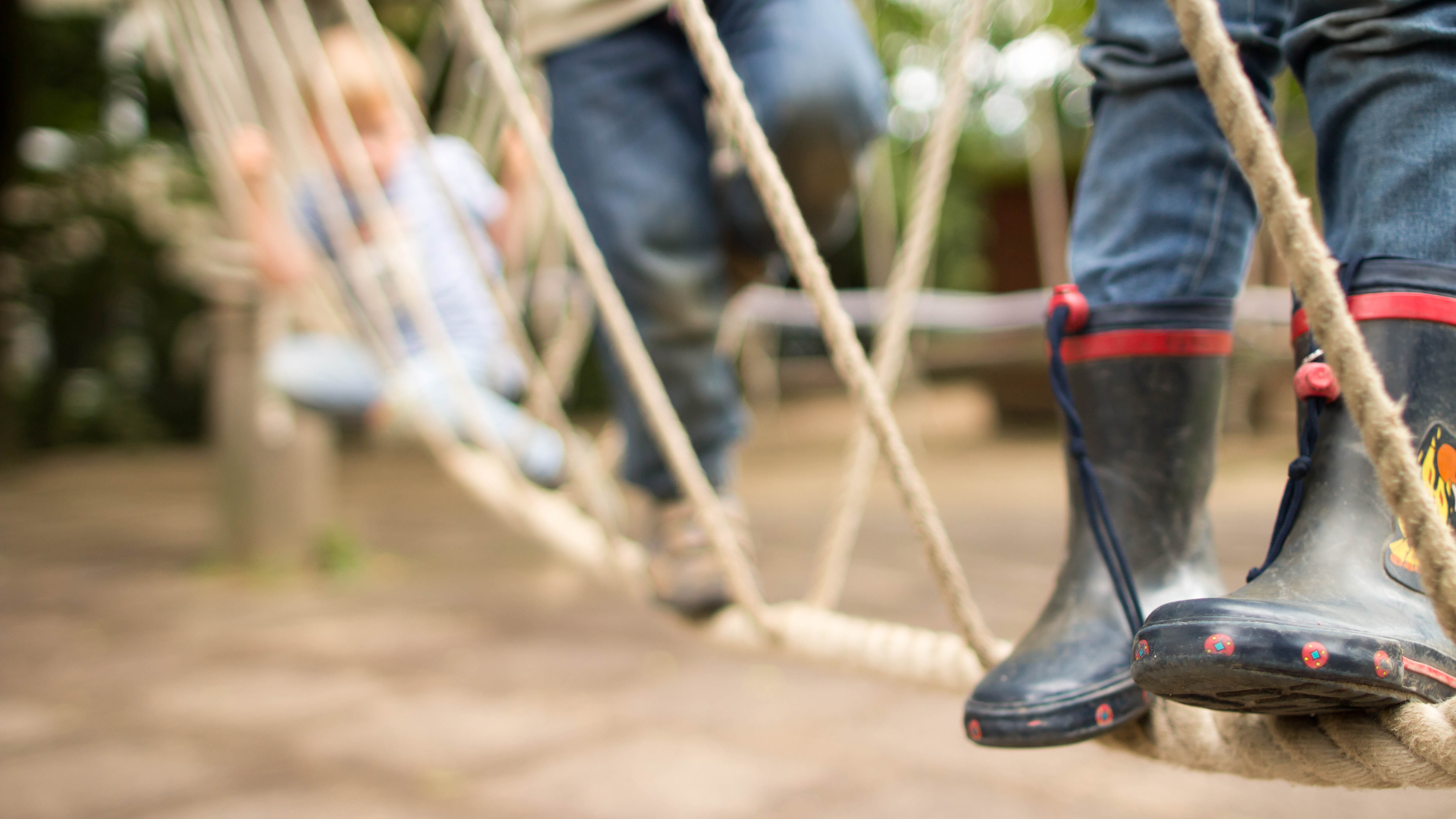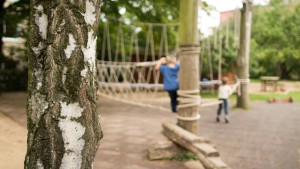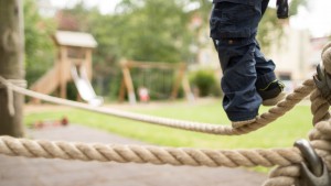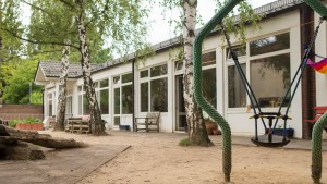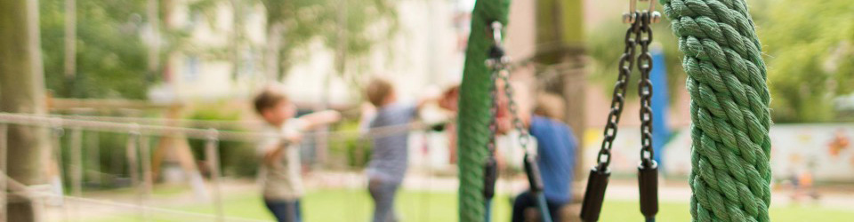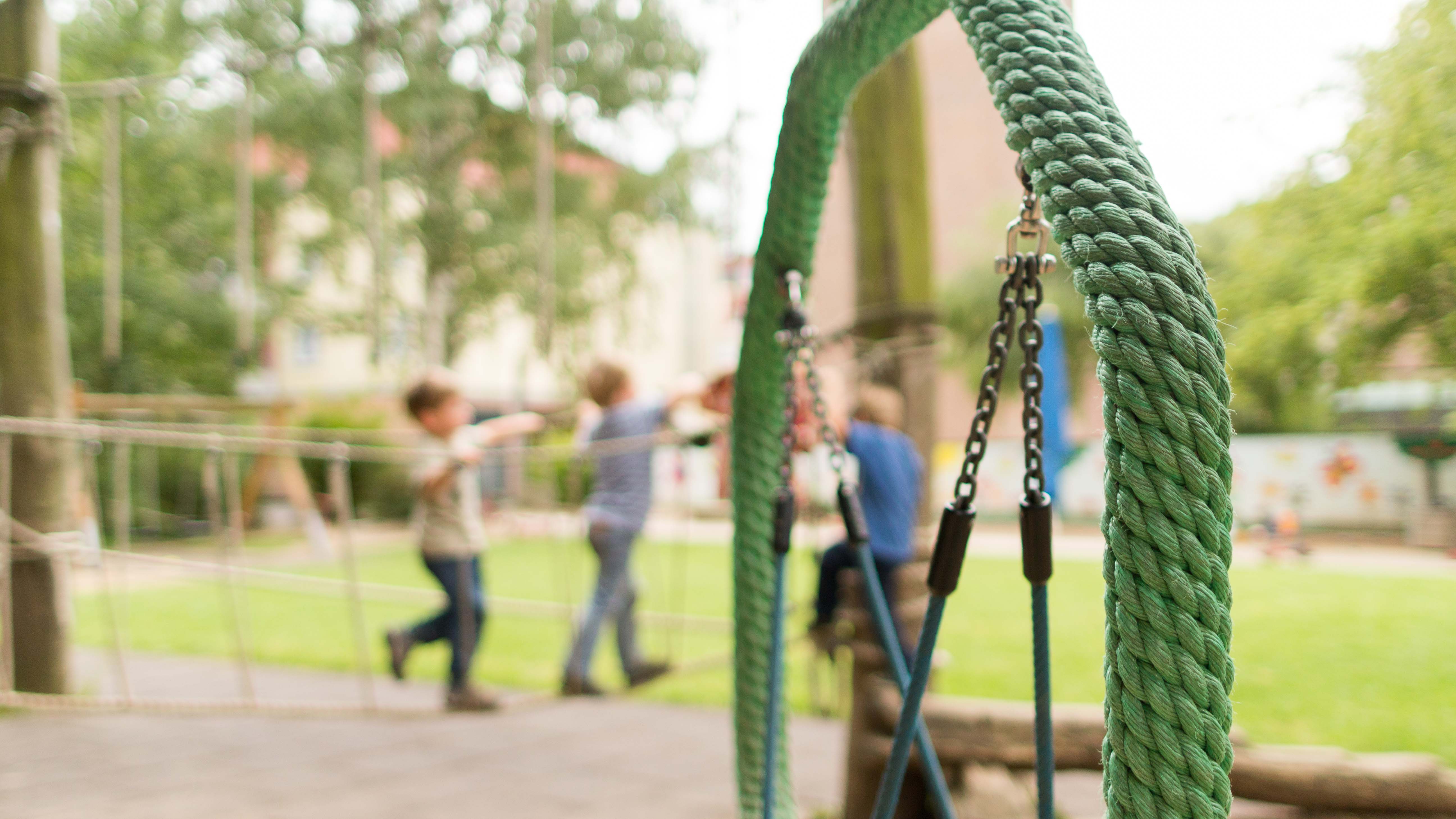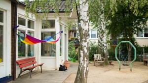 Unsere Kinder können bei Wind und Wetter das großzügige Außengelände mit dem Seil-Kletterpfad, einem großen Sandkasten, Schaukeln, einem großen Rutschturm und den Hängematten nutzen. Für die jüngeren Kinder gibt es zusätzlich noch ein kleines Klettergerüst, eine Schaukel und eine Holzeisenbahn. Die große Rasenfläche lädt alle Kinder zu Ballspielen und zum Toben ein.