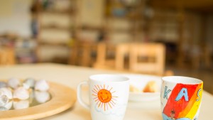 Im Café essen viele Kinder morgens ihr mitgebrachtes Frühstück. Wir sind eine Kita mit Ganztagesbetreuung und bieten täglich ein warmes Mittagessen an. Die Kinder essen zeitgleich in allen Funktionsräumen und im Café.
