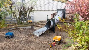 • Ein naturnah gestaltetes Außengelände mit unterschiedlichen Bodenbeschaffenheiten – Sand, Steine, Rindenmulch und Wiese;